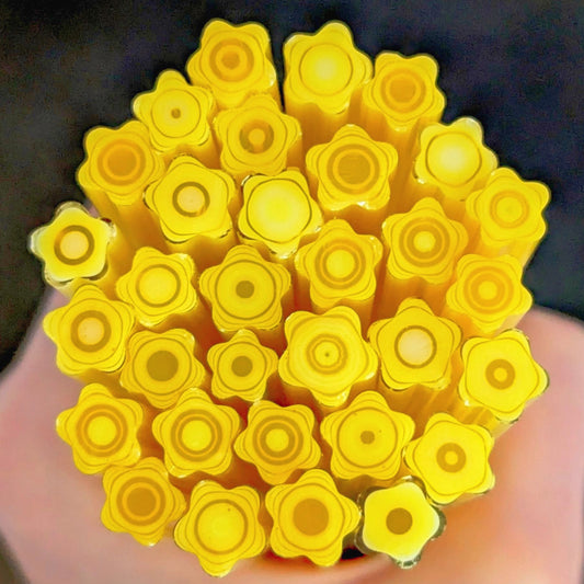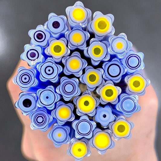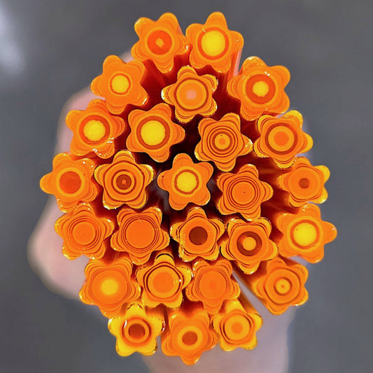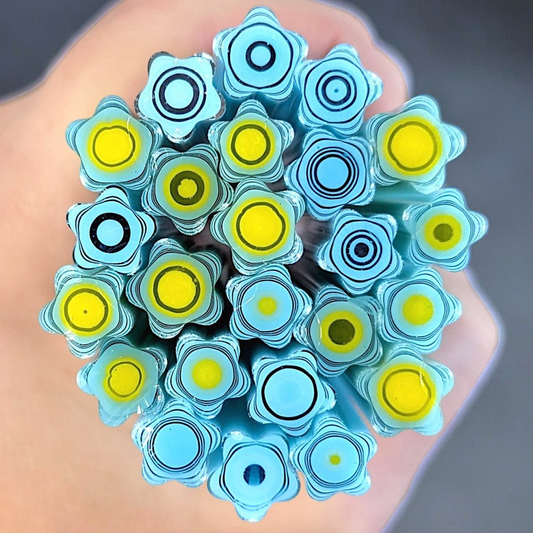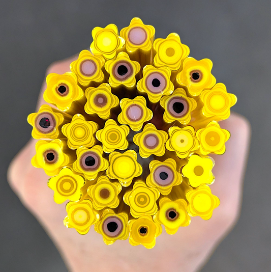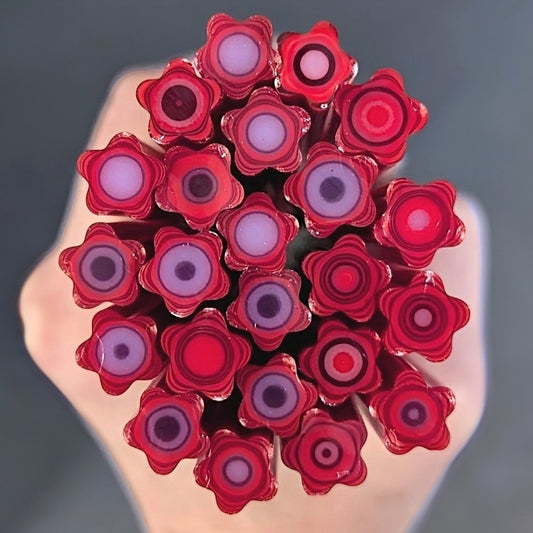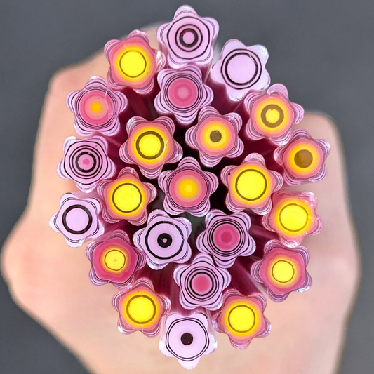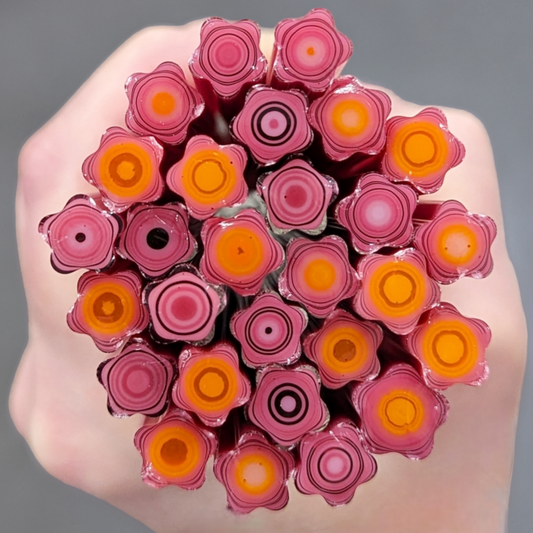 All Floral Inspired Murrini in this category is hand-pulled Bullseye Glass COE 90. To keep the shape of this specialty murrini, do not fire more than 1345 - 1365 degrees Fahrenheit.