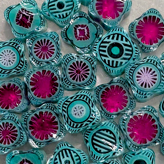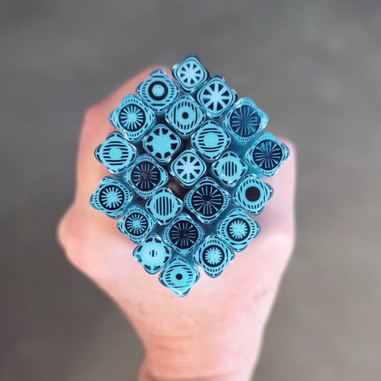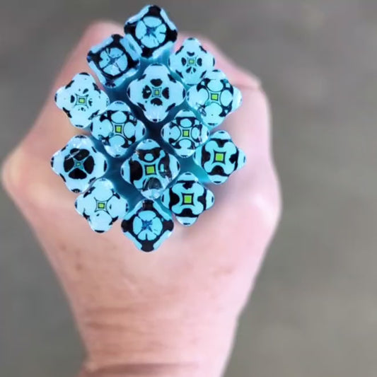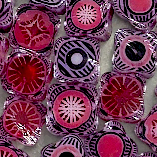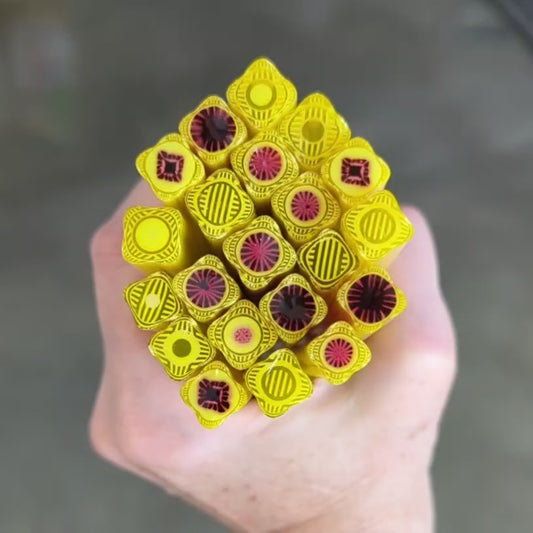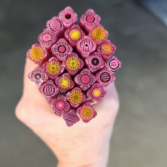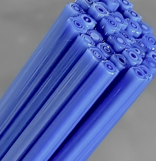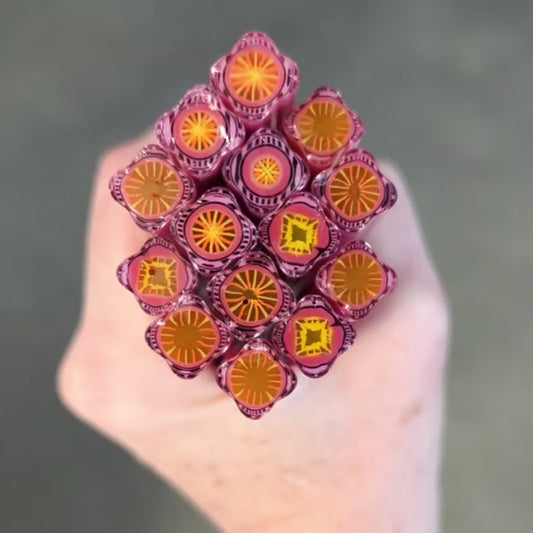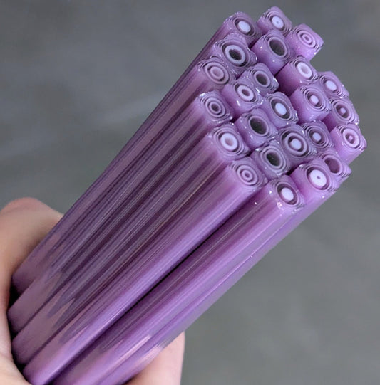All Square Murrini in this category is hand-pulled Bullseye Glass COE 90. To keep the shape of this specialty murrini, do not fire more than 1345 - 1365 degrees Fahrenheit.