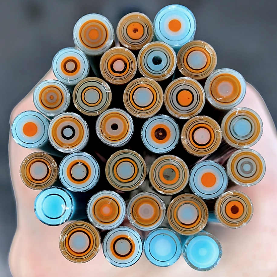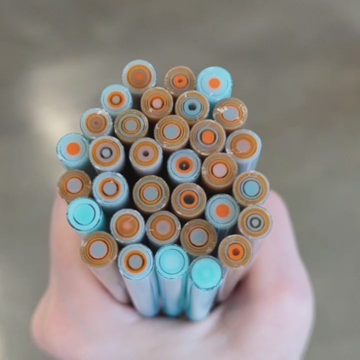 Murrini is hand pulled COE 90 Bullseye glass, available in cane and slices, and sold by the ounce. As each pull is one of a kind, murrini may vary slightly from images above.