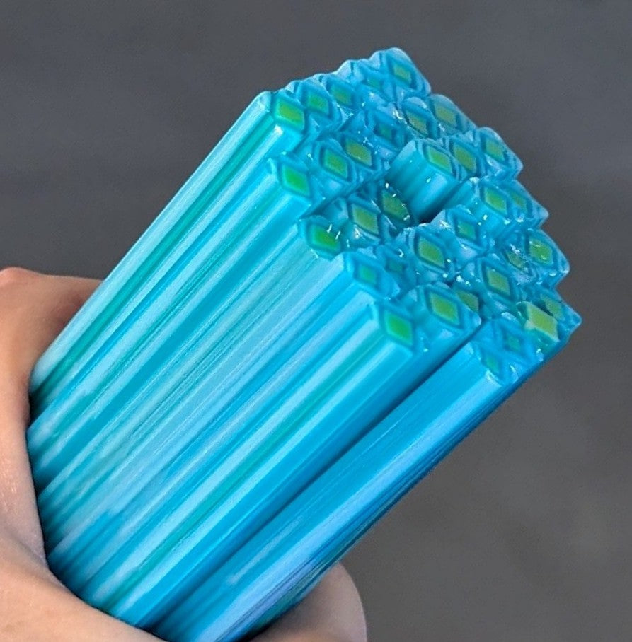 1oz Cane: 4-5 pieces of cane per ounce, each piece is approx 2" - 2.25" in length from various areas of the pull for variety. No hollows. Width of Cane is typically between 7mm - 9.5 mm.