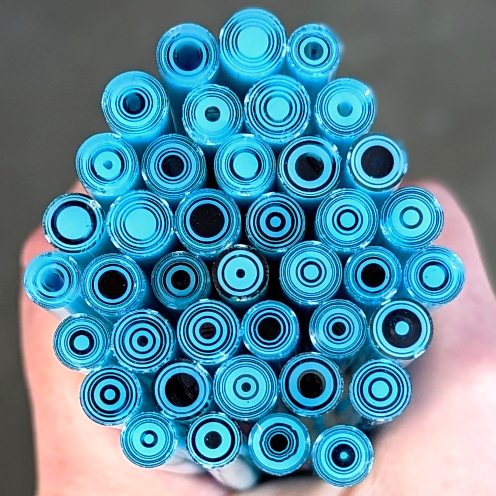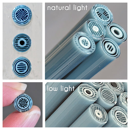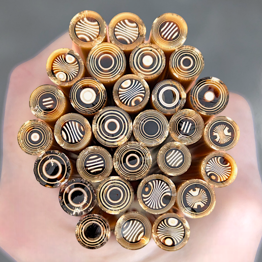 Cane: 5 pieces of cane per ounce, each piece is approx 2"-2.25" in length from various areas of the pull for variety. No hollows. Diameter of Regular Cane is typically between 6mm - 8.5 mm.