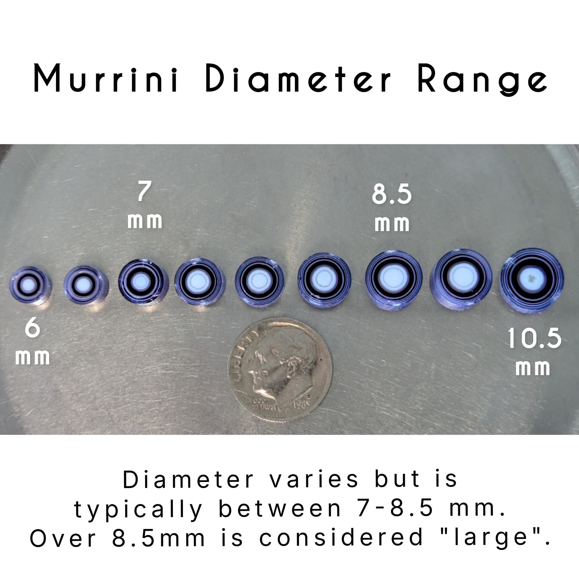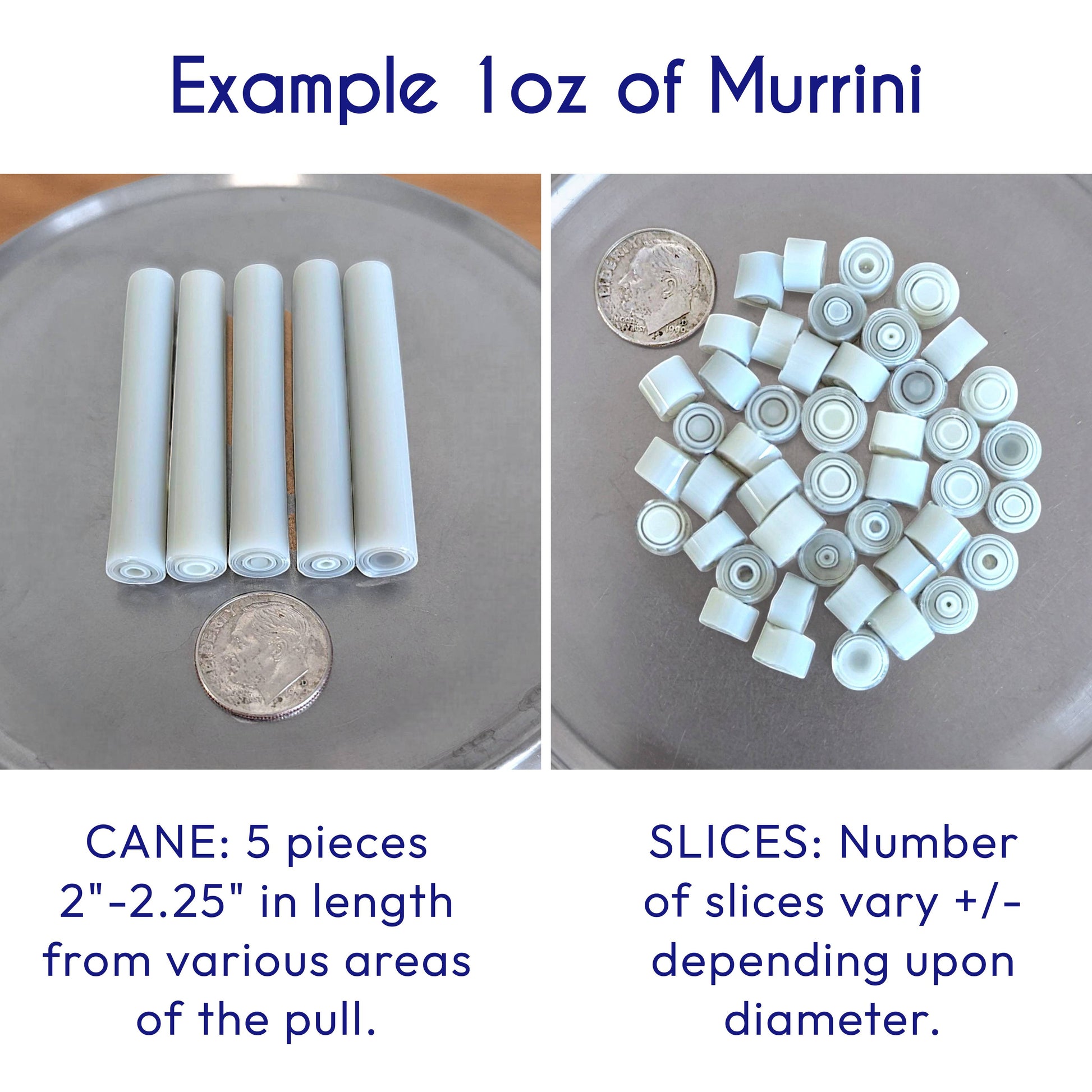 Slices: Number of slices will vary depending upon the diameter of murrini. Slices are typically between 1/8" - 1/4" (3mm - 6.5mm) tall but may vary slightly + or -. An entire pot is chopped, mixed up for variety and then sorted into 1oz bags. No hollows. Diameter of Sliced Murrini is typically between 6 - 10.5 mm.