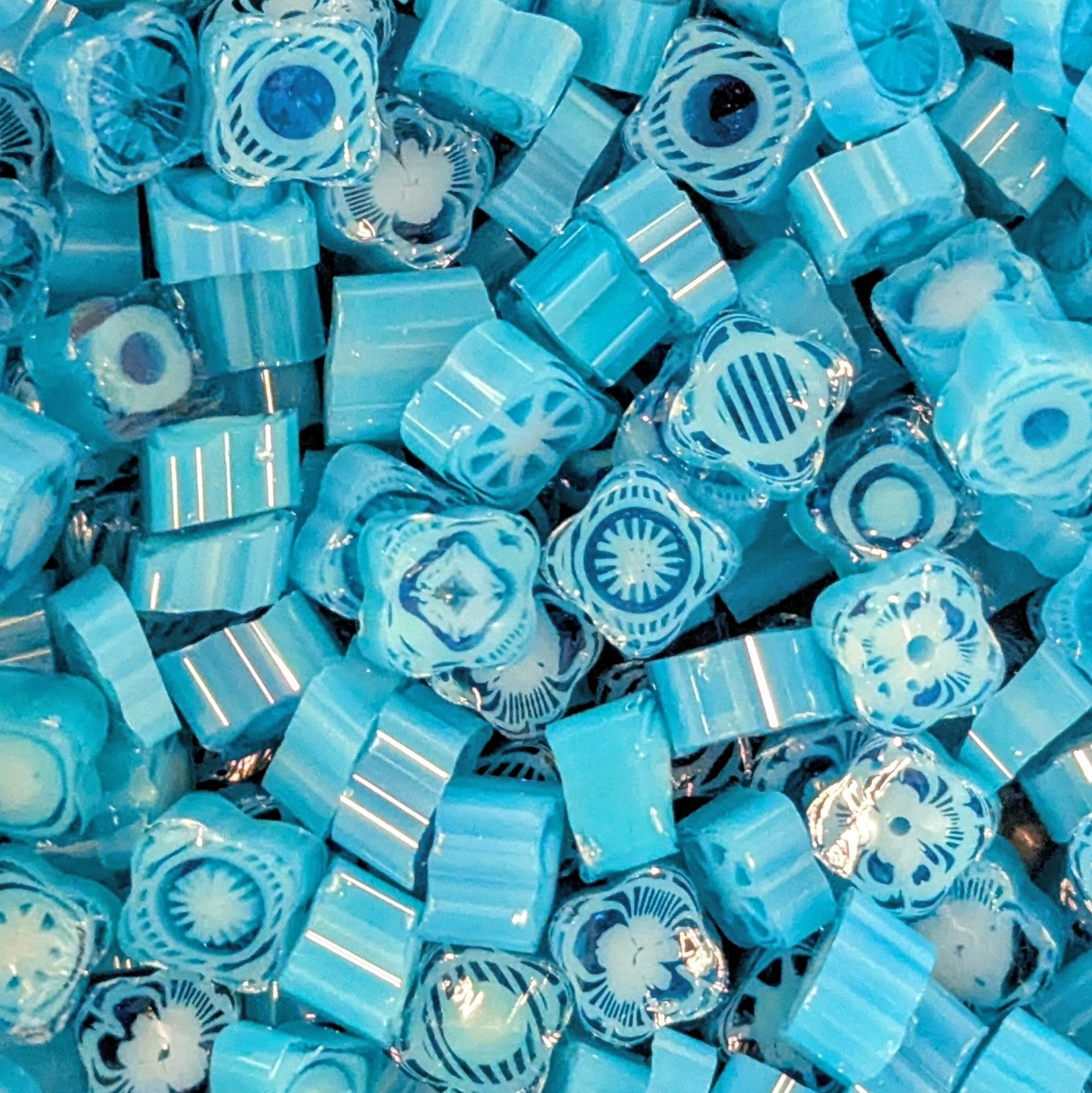 Have some fun with this play pack! Includes fabulous murrini odds and ends. Seconds, Cane Nips, Tiny, Big, Thin, Thick, Longer, Shorter, Hollows, Slanted Slices, you name it. Great for adding to your creations.