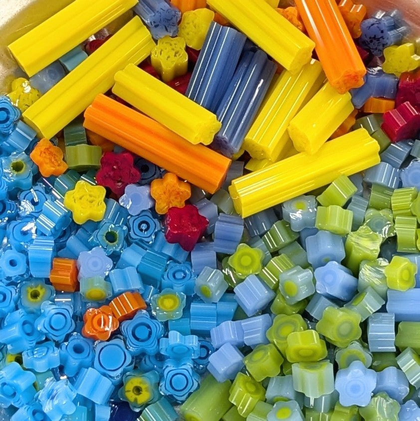 Have some fun with this play pack! Includes fabulous murrini odds and ends. Seconds, Cane Nips, Tiny, Big, Thin, Thick, Longer, Shorter, Hollows, Slanted Slices, you name it. Great for adding to your creations.