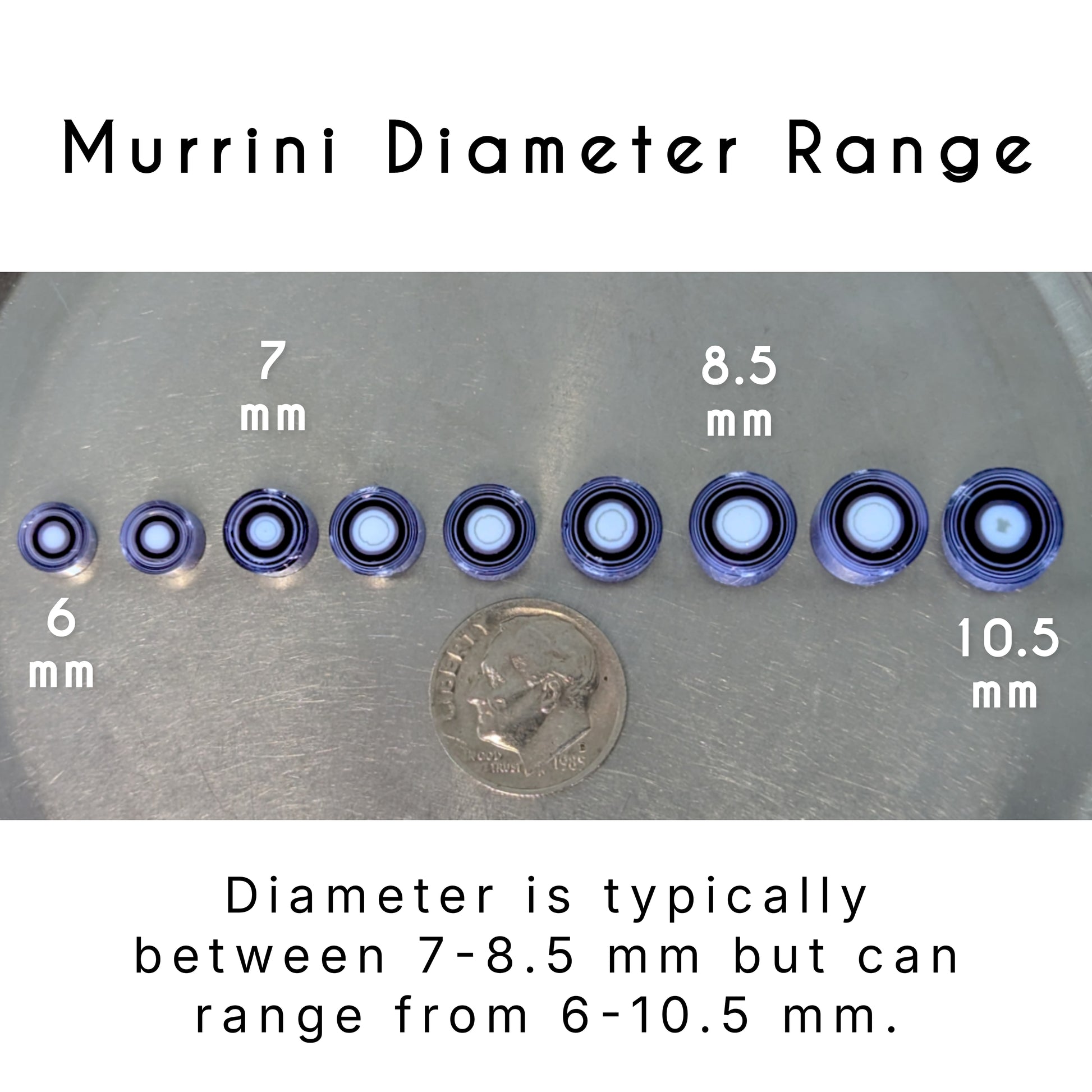 Slices: Number of slices will vary depending upon the diameter of murrini. Slices are typically between 1/8" - 1/4" (3mm - 6.5mm) tall but may vary slightly + or -. An entire pot is chopped, mixed up for variety and then sorted into 1oz bags. No hollows. Diameter of Sliced Murrini is typically between 6 - 10.5 mm.