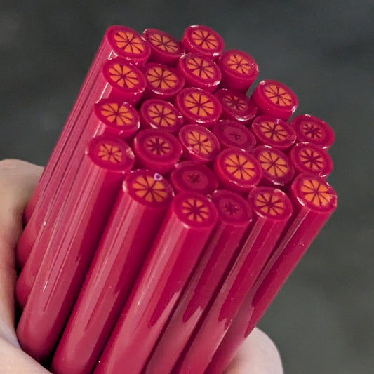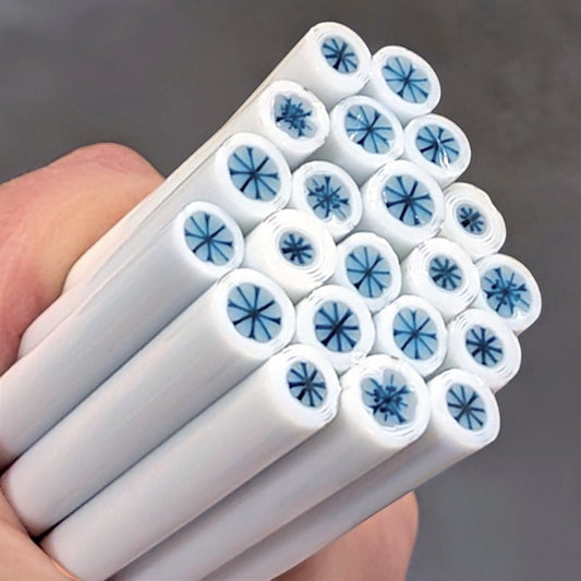 Cane: 5 pieces of cane per ounce, each piece is approx 2" - 2.25" in length from various areas of the pull for variety. No hollows. Diameter of Regular Cane is typically between 6mm - 8.5 mm.