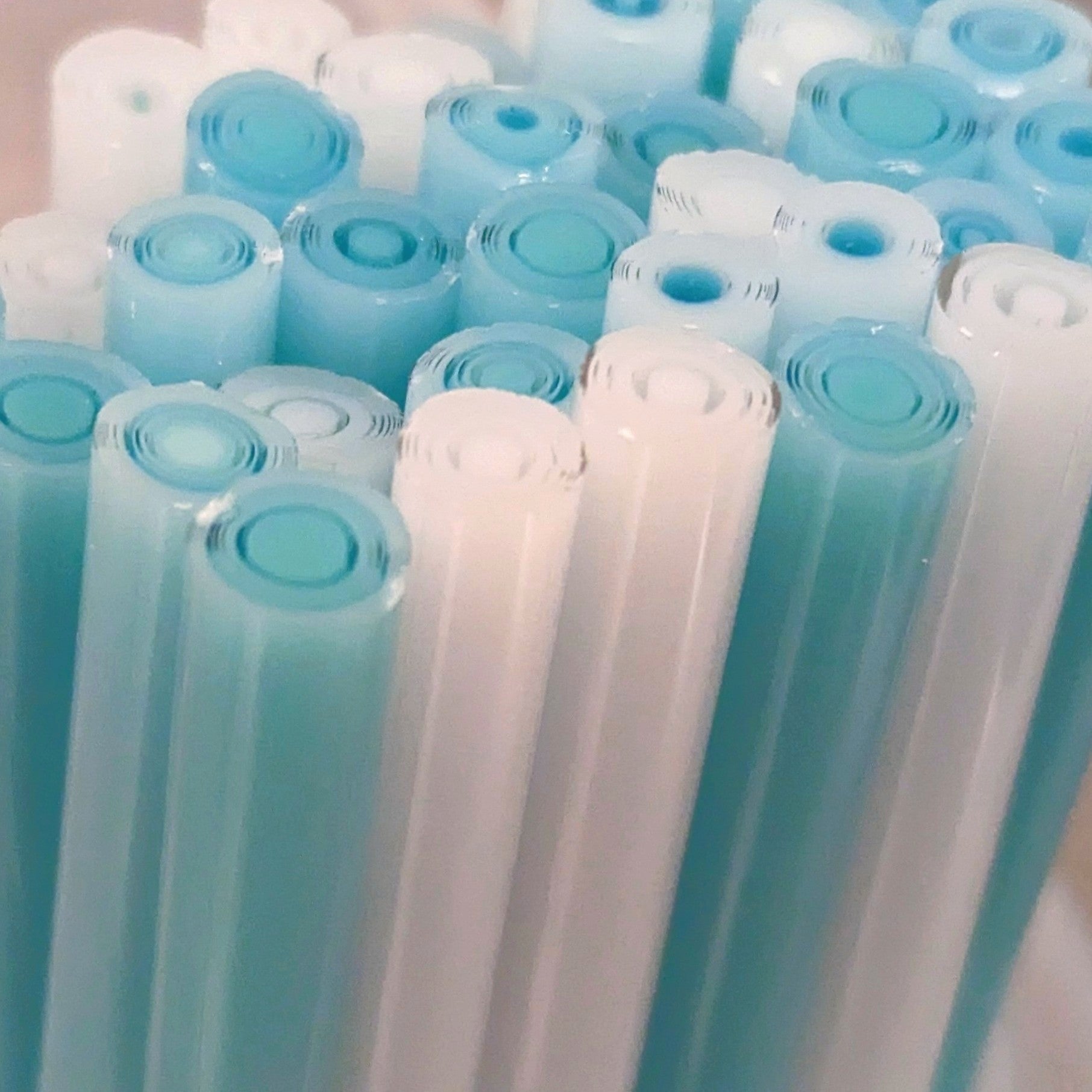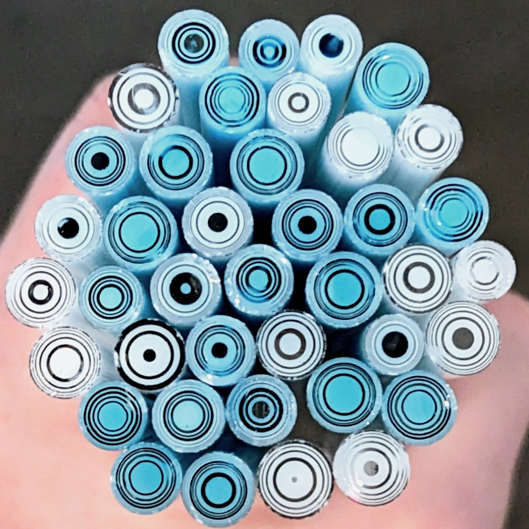 Cane - Small Diameter: 7 pieces of cane per ounce, each piece is approx 2" - 2.25" in length from various areas of the pull for variety. No hollows. Diameter of Small Diameter Cane is typically between 5mm - 6.5mm.