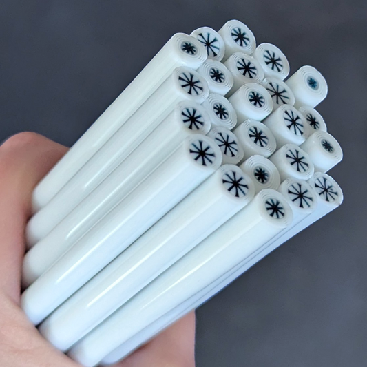 Cane: 5 pieces of cane per ounce, each piece is approx 2" - 2.25" in length from various areas of the pull for variety. No hollows. Diameter of Regular Cane is typically between 6mm - 8.5 mm.