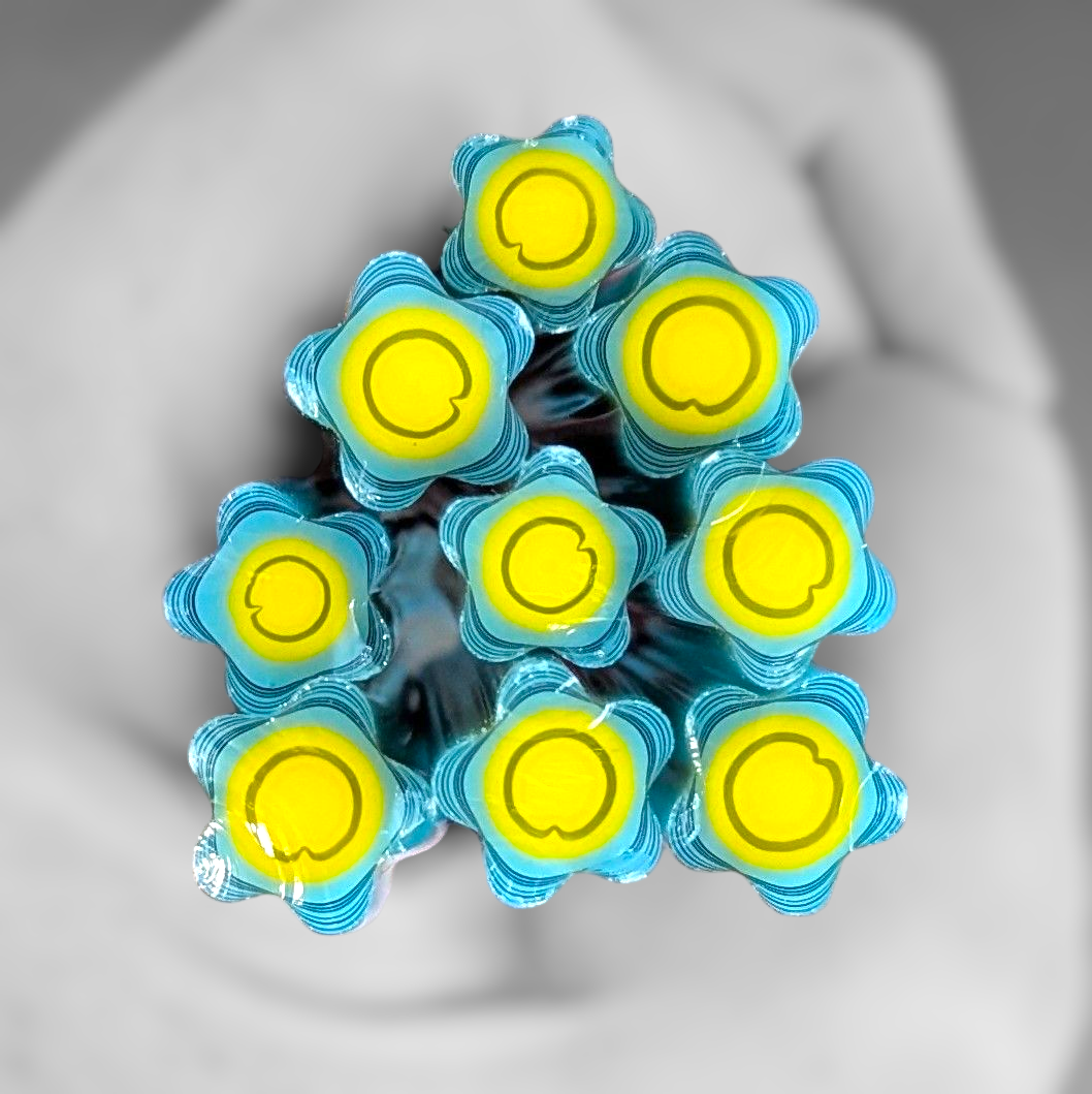 Large Variation Forget Me Not COE 96 Floral Inspired Oceanside Murrini has a distinct five petal flower shape and includes hues of opal and transparent blues, white and yellow.