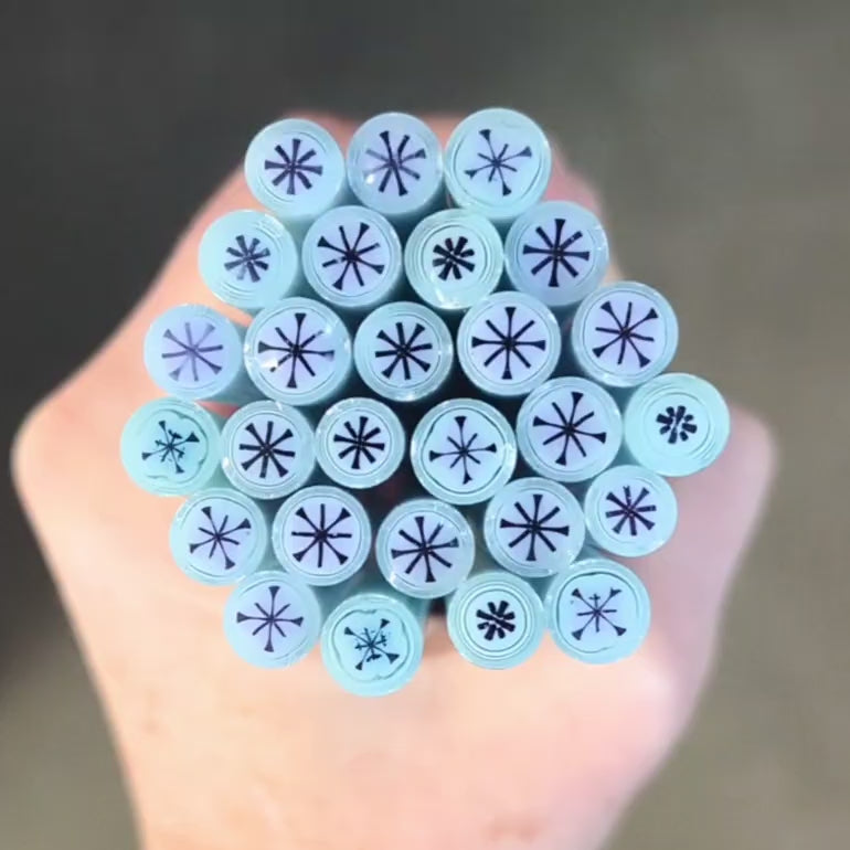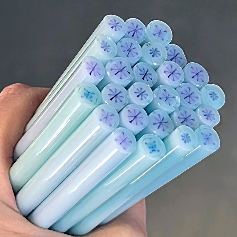 Cane: Typically 5 pieces of cane per ounce, each piece is approx 2" - 2.25" in length from various areas of the pull for variety. If diameter is on the larger end of the range, may be 4 pieces. No hollows. Diameter of Cane is typically between 6mm - 8.5 mm.