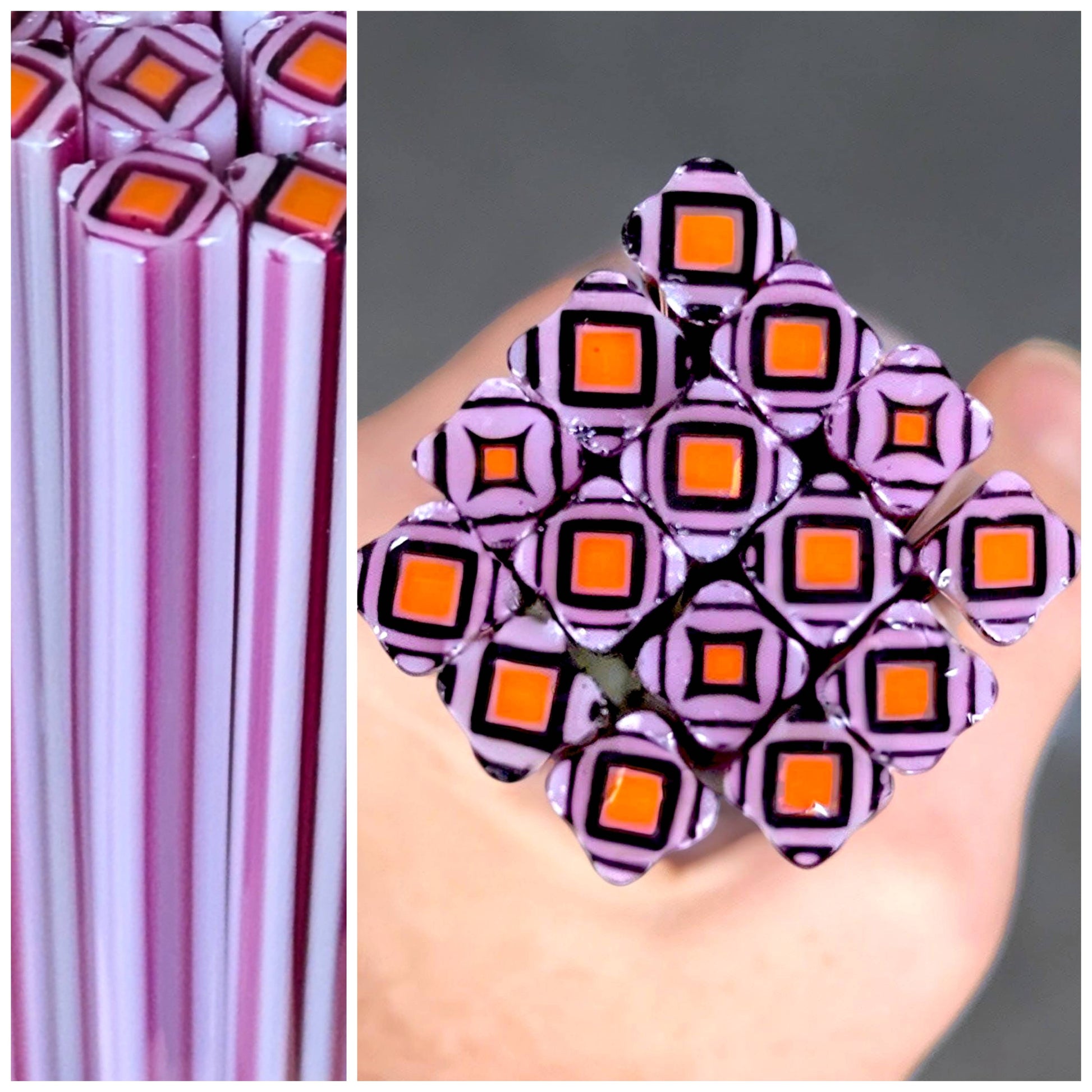 Med/LG Cane: 4 pieces of cane each approximately 2" in length from various areas of the pull for variety. Width of M/LG Square Cane is typically 7.5-9.5mm.