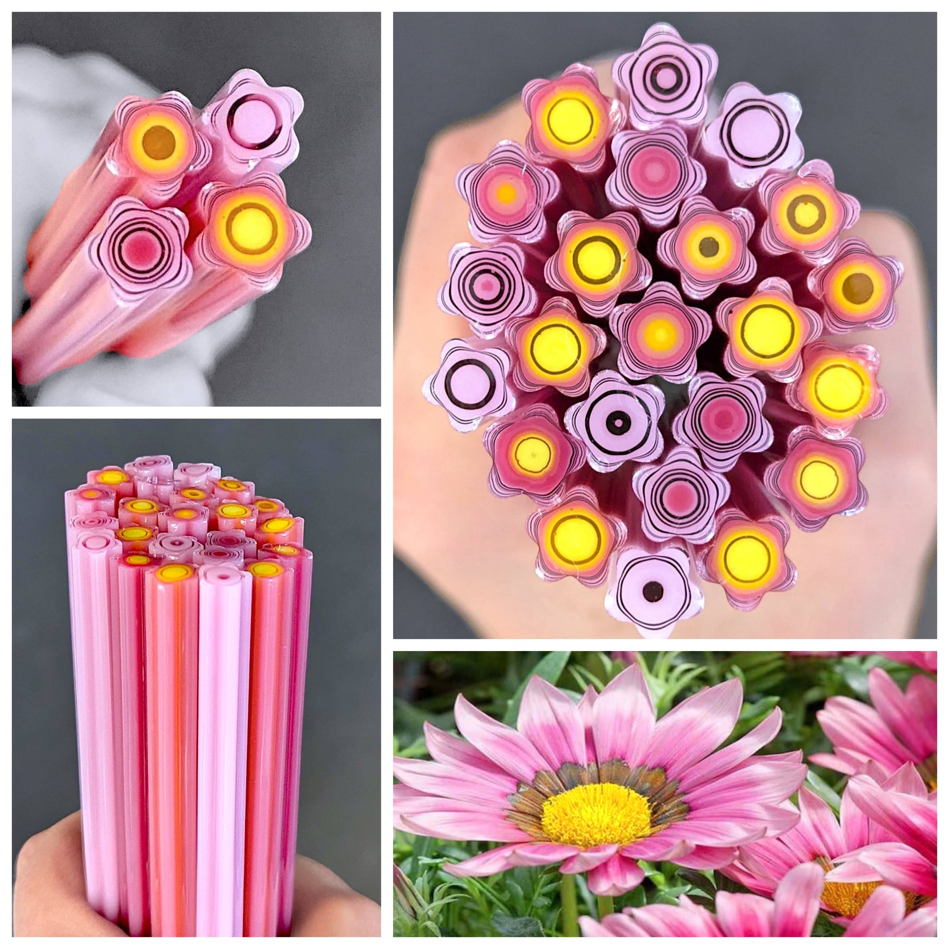 Med/Large Pink Gazinia COE 90 has a distinct five petal flower shape and includes hues of opal and transparent pink, yellow and white.