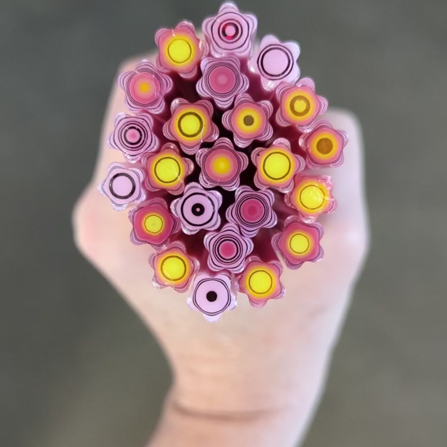 Murrini is hand pulled COE 90 Bullseye glass, available in cane and slices. To maintain murrini shape, we recommend not firing over 1345 - 1365 degrees Fahrenheit.