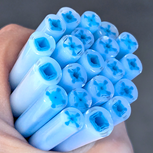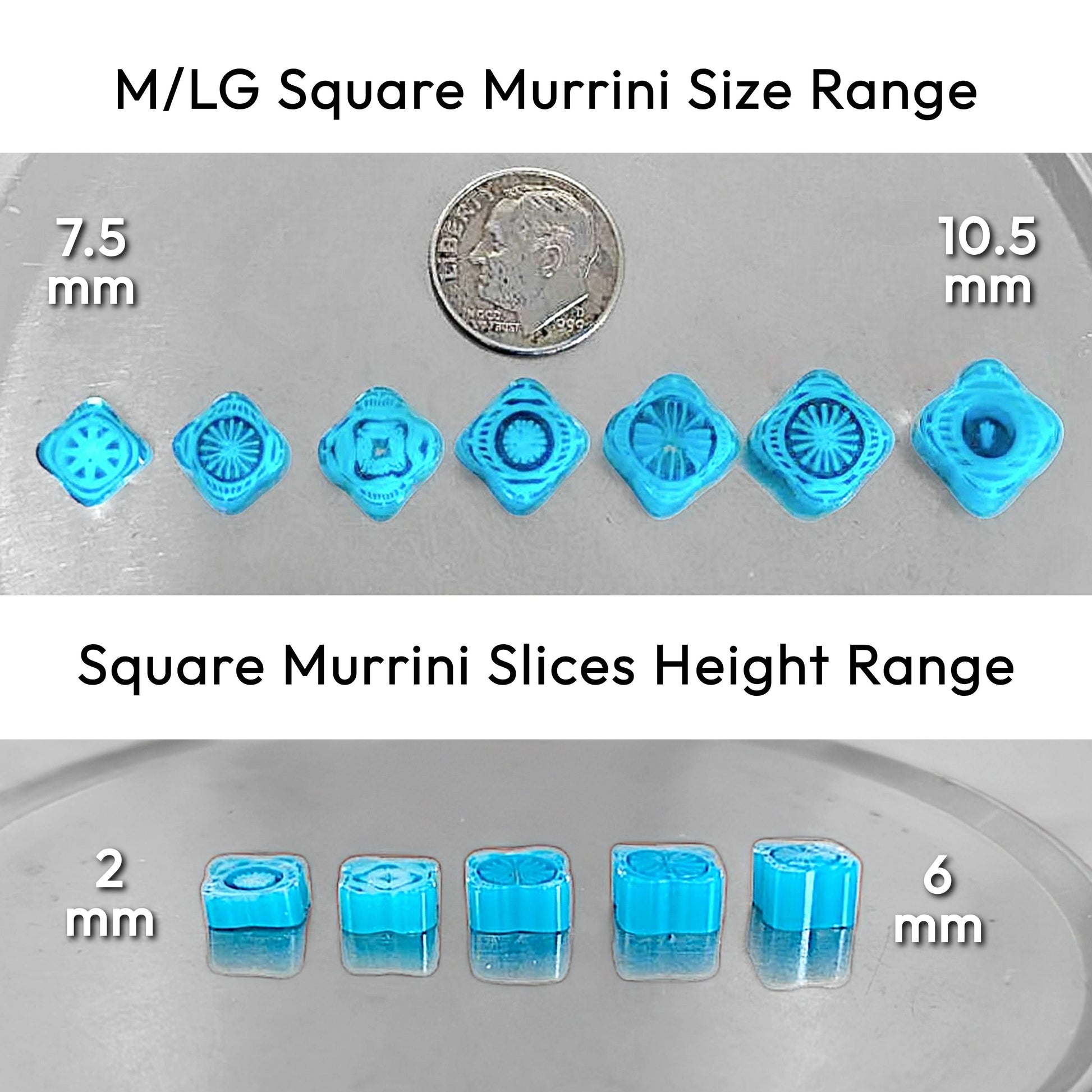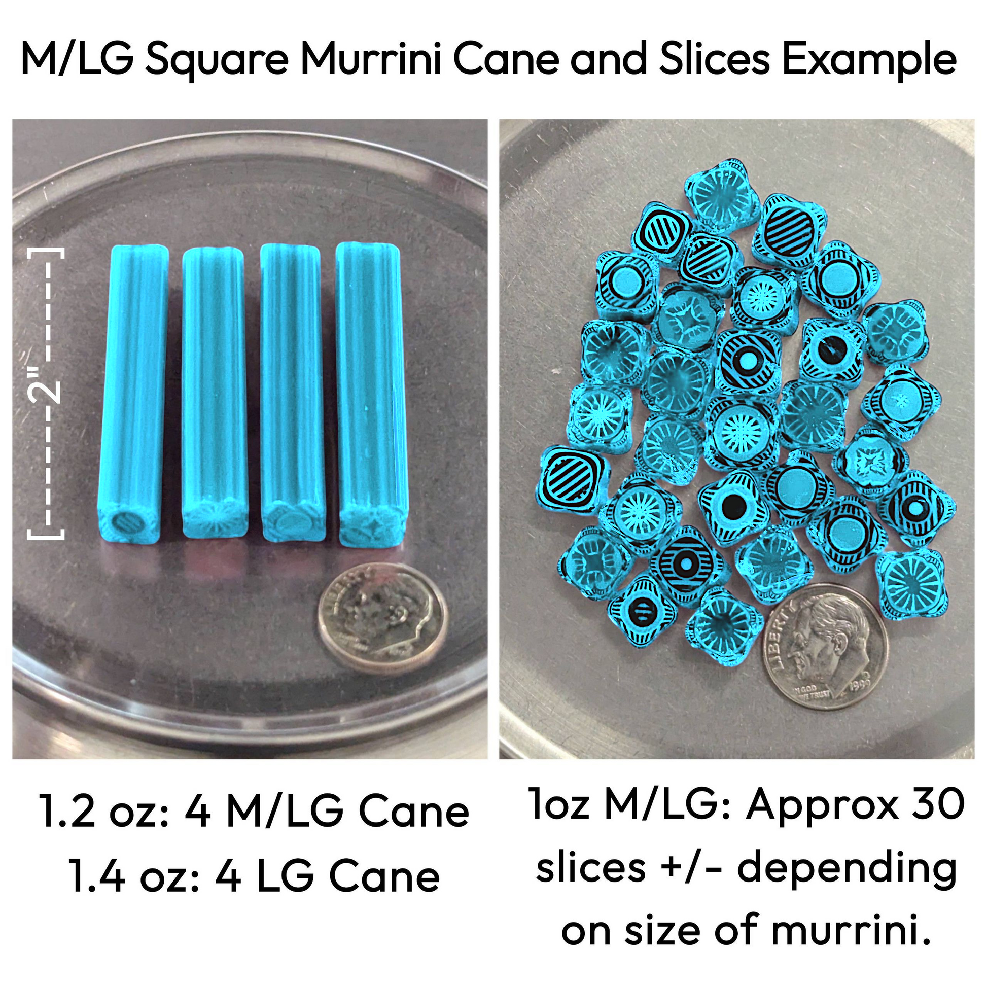 1 oz Med/LG Slices: Approximately 30 slices (may vary slightly + or - depending upon the width/height of the murrini). Slices are typically between 2mm - 6mm tall but may vary slightly. Width of Sliced M/LG Square Murrini is typically between 7.5 - 10.5 mm.