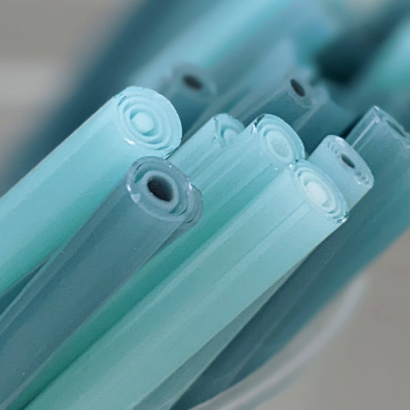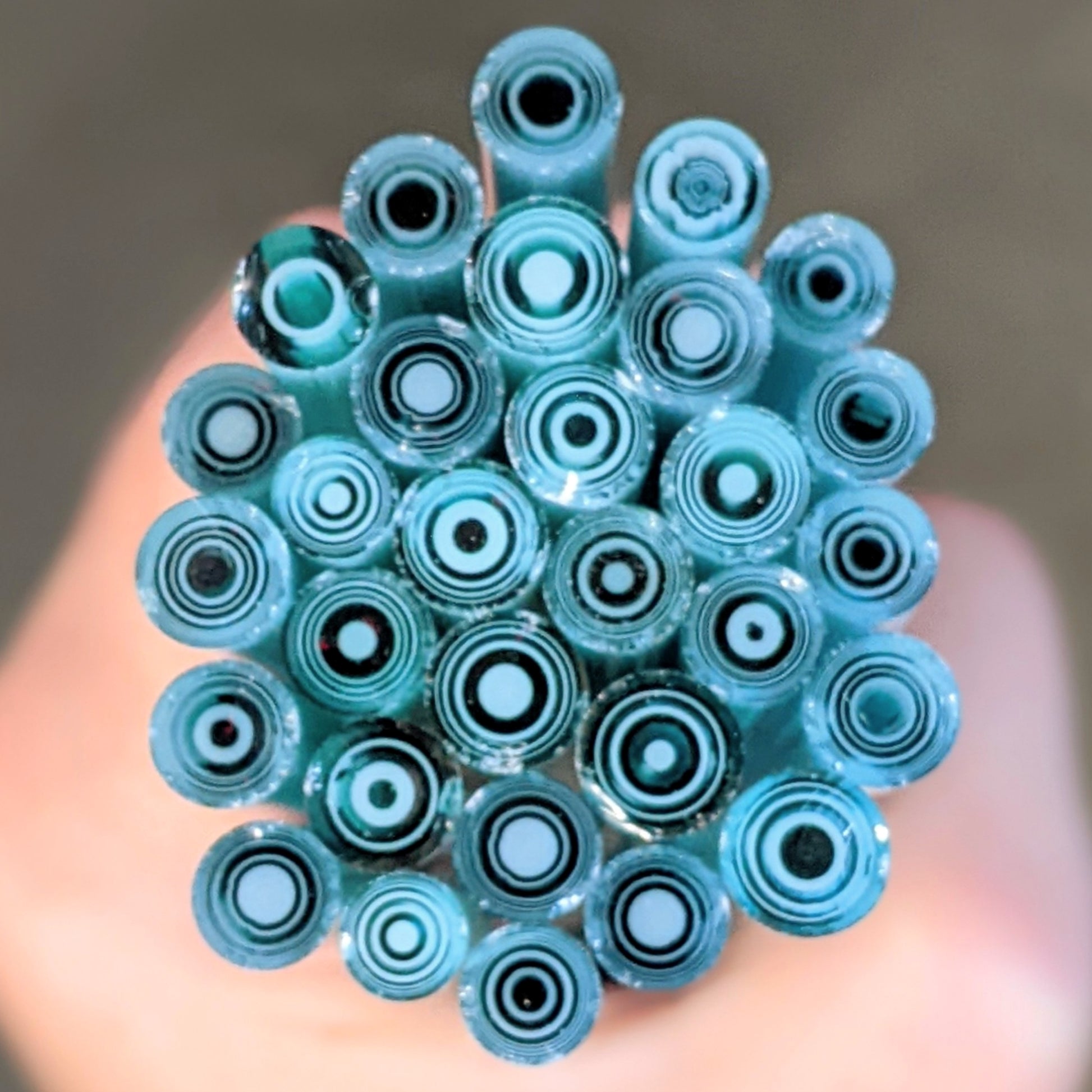 Murrini is hand pulled COE 90 Bullseye glass, available in cane and slices, and sold by the ounce. Diameter of standard murrini is typically between 5 - 8 mm. As each pull is one of a kind, murrini may vary slightly from images above.