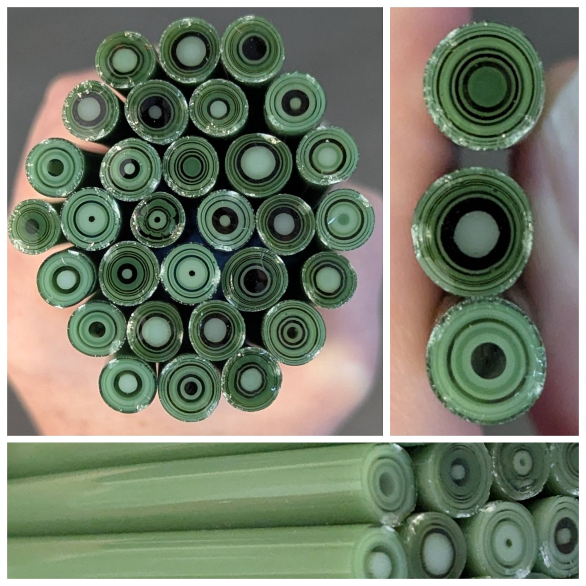 Murrini is hand pulled COE 90 Bullseye glass, available in cane and slices, and sold by the ounce. As each pull is one of a kind, murrini may vary slightly from images above.