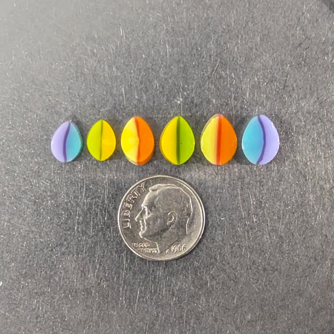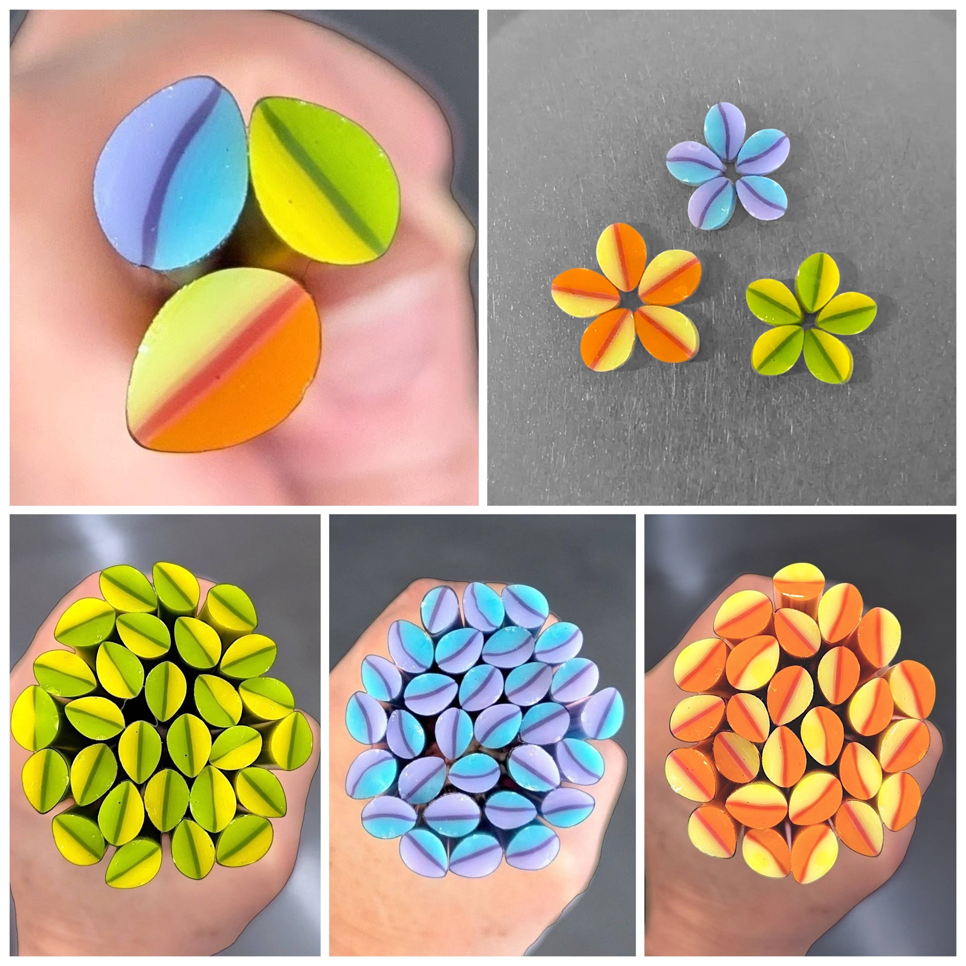 Cane - Two of Each Color 1.5oz: 6 pieces of petal murrini (two of each color) each approximately 2"-2.5" in length from various areas of the pull for variety.