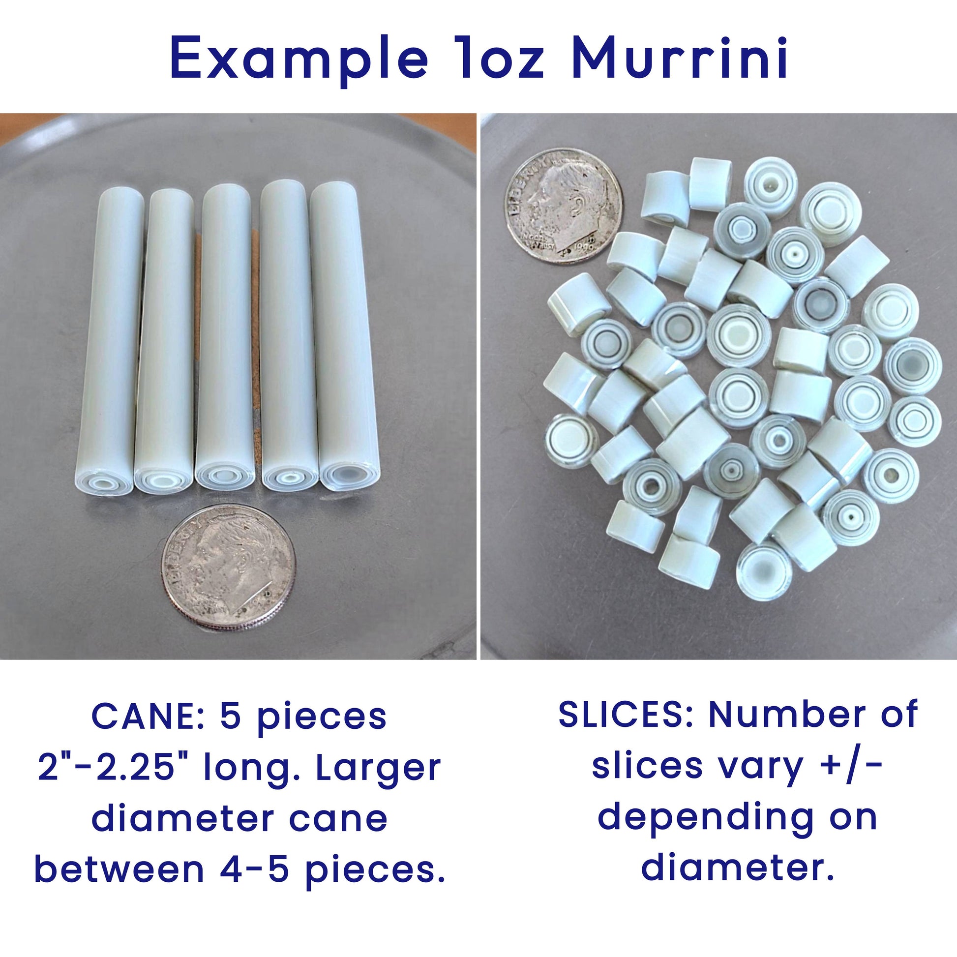 Slices: Number of slices will vary depending upon the diameter of murrini. Slices are typically between 1/8" - 1/4" (3mm - 6.5mm) tall but may vary slightly + or -. An entire pot is chopped, mixed up for variety and then sorted into 1oz bags. No hollows. Diameter of Sliced Murrini is typically between 6 - 10.5 mm.